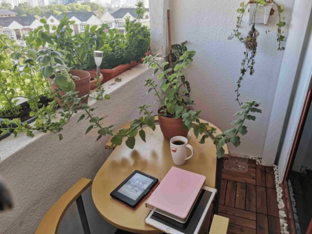 I was thinking of walking to the nearest cafe to read blogs and journal but realize I have a perfectly good spot in my apartment to do that. If you have been following my BalconyNest posts, the nest is at the upper right corner of the pic, hanging from the plant.