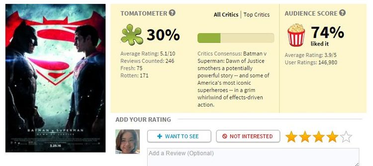 Batman v Superman is not a perfect movie, but it certainly doesn’t deserve a 29% rating. 2007’s Fantastic Four (36%) is in no way better than this movie.
