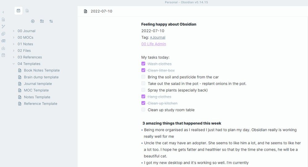 Obsidian is a free software that works with plain text, markdown files. It’s a favourite among those in the Personal Knowledge Management space. However, it is also a great way to manage your productivity, albeit a geekier one where some code knowledge is needed. But markdown is quite an easy language to learn, promise! Here’s a screen capture of a daily journal entry which also doubles up as my todo list. (My work daily journal + task list is far more complicated and has way more tasks!)