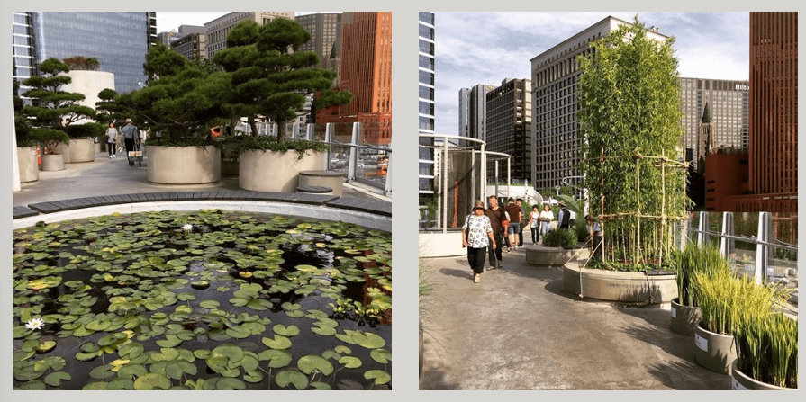 Now, pedestrians can walk on this former overpass, which is 17m above the busy city road, to some of Seoul’s popular attractions such as Sungnyemun Gate, Hanyang City Walk and Namdaemun Market while enjoying the 228 species of plants, foot baths, sitting alcoves, cafes, observation towers, ponds and trampolines that dot this route.